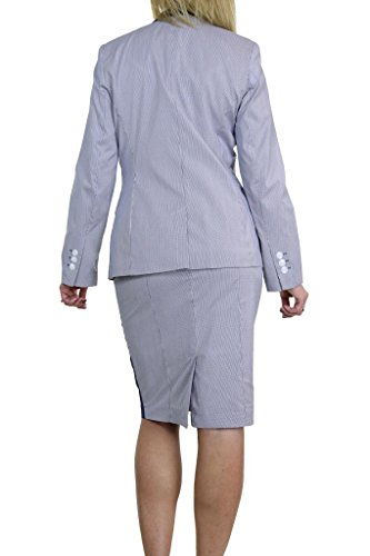 Description : You are looking at a 2 piece skirt suit. The fabric is a light weight tiny checked pattern, with a slight crisp feel. The background colour is light grey, and the contrast is navy blue. These suits are made to a very high standard of tailored finish! Jacket: Fully lined, shoulder pads, 1 large bone effect front button. The front has a mock slit pocket, and 2 flap pockets. The cuff of the sleeves have 3 small matching buttons. The back has a slit vent. Skirt: fully lined, invisible back zip to put skirt on, The waistband and side panels have contrast to match the jacket. The back has an open vent.