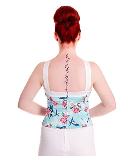 Description : Pretty stretch cotton top with pink rose and blue swallow fabric detail. Panelled, lined, bodice with sweetheart neckline (please note due to the panelling on the bodice, the material pattern won't line up at seams). White cotton straps that cross over at front and then have adjustable button fastenings at back. Hidden zip to centre back of top. Please note you are buying the top only. Skirt is not included. Machine washable (wash and iron inside out) Material : 98% Cotton, 2% Elastane Length: Waist