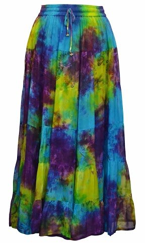 Description : Horizontally tiered skirt which is tie dyed over printed/patterned and plain viscose chiffon material and lining. Elasticated waistband with drawstring. Measurements: Age 8-10 - Waist 25-38", Length 31". Age 10-12 - Waist 27-40", length 33"