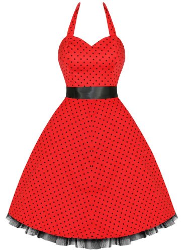Description : Timeless Polka dot dress, which has the sweatheart neckline and tie back neck. The dress also has a easy side zip fastening, with elasticated back for comfort. Gorgeous large flared skirt which looks stunning with an added 26"-27" petticoat. This is a 100% Cotton Fabric.