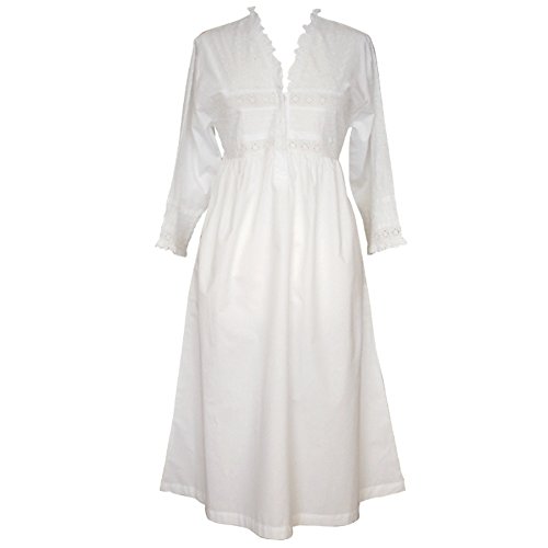 Description : Elizabeth Powell Craft Ladies Cotton NightdressOur Elizabeth Powell Craft Ladies Cotton Nightdress is a white long sleeved nightdress with with broderie anglaise trims and a frilly V neck line. The Elizabeth Powell Craft Ladies Cotton Nightdress is handmade, 100% cotton and machine washable.The Elizabeth Powell Craft Ladies Cotton Nightdress is One Size, the bust measures 108cm and the length 113cm