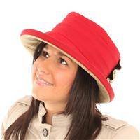 Description : LADIES RED WAX HAT WITH TWEED BOW FULLY LINED SENT BOXED SIZE 57CM SHELL 100% COTTON BRIM 100% WOOL