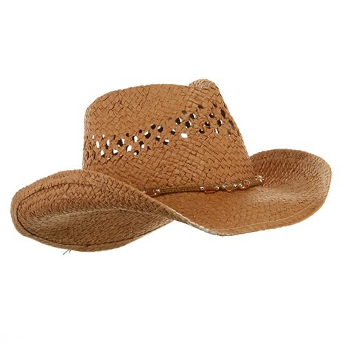Description : This Ladies Brown Toyo Straw Cowboy Hat adds flair to any country summertime look and works great on everyone! Made of 100% woven straw, this cowboy hat is every bit as authentic as it looks. A sweat band on the interior of the crown allows your pores to breathe on hot, sweaty days. Glass beads with braded hemp and decorative holes adorn the crown. Brim is 4" wide and crown is 4" deep. One size fits most.