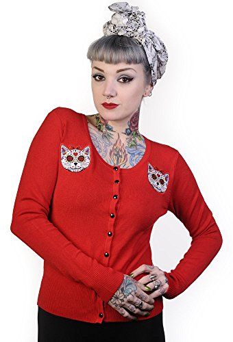 Description : If you love the Sugar Kitty bags that are in the shops you will adore this Sugar Kitty cardigan. Styled to fit in with Rockabilly/Psycho billy fashion, the piece is with embroidered sugar kitty appliques on the front. It features contrasting buttons that match the the appliques. The sleeves are long and have ribbed cuffs. This lightweight soft knitted fabric includes some Spandex so that it stretches to achieve a comfortable slim fit. This is a top quality cardigan and is a must for your alternative clothing collection.