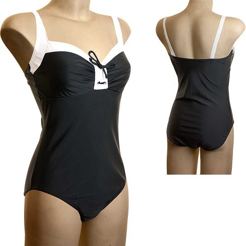 Description : This lovely black and white sleek fitting swimsuit has an attractive white band with black tie detail and white straps, which draw the eye to the bust-line of this gorgeous swimsuit. Inner bust support and full front lining for tummy control make this a winner of a swimsuit.