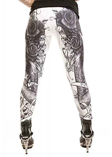 Description : These gothic Bella Rose Leggings by Alchemy Black are super eye-catching with an all over print of a tattooed girl, surrounded by beautiful roses. These comfy leggings have an elasticated waistband and look awesome with a graphic black top!