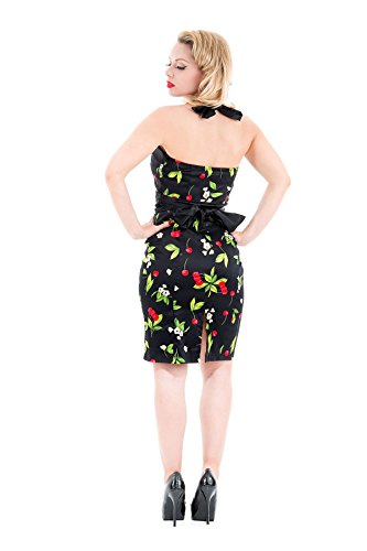 Description : Vintage inspired 40's 50's pencil wiggle dress. Soft cotton fabric which has a slight stretch. Black background to fabric with cherry print design. Fits figure-hugging to give an hour glass shape. Halterneck black straps tie at back of neck. Black satin detailing to front of neckline; three black buttons down front at bustline. Thick satin panel at waistline; concealed zip to side. Sexy split at back of skirt section. New with tag, in packet. Measurements: Length: Approx. 30" underarm to hemline Bust: UK size 8 fits bust approx. 32" UK size 10 fits bust approx. 34" UK size 12 fits bust approx. 36" UK size 14 fits bust approx. 38" UK size 16 fits bust approx. 40" UK size 18 fits bust approx. 41"